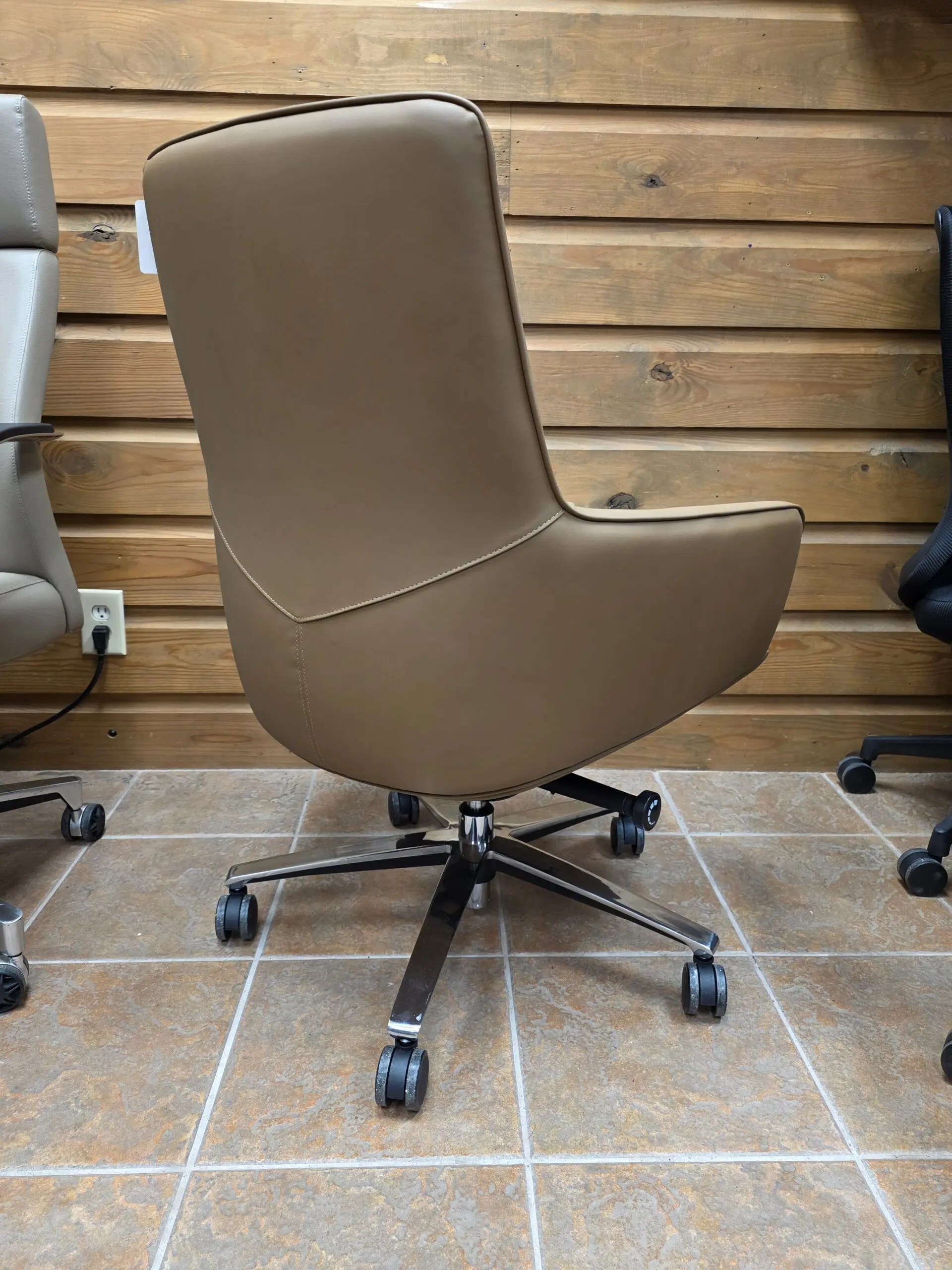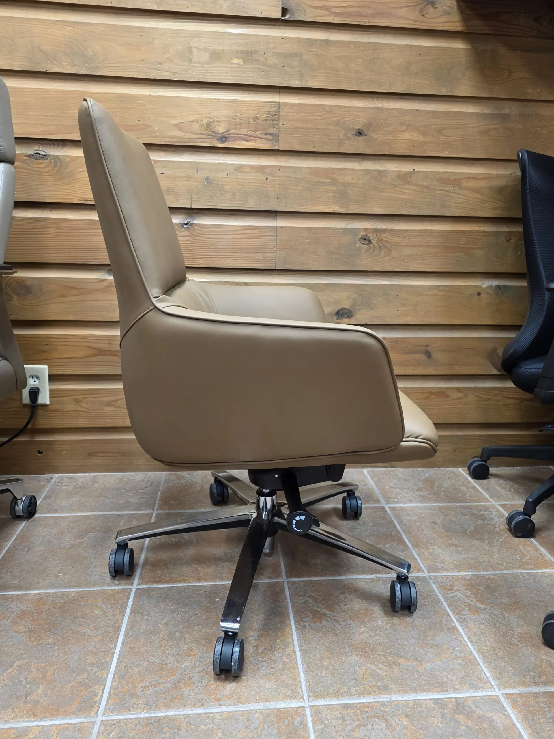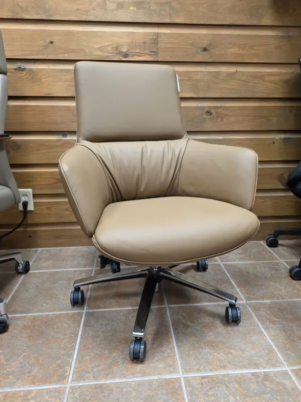 Built on a strong chrome-finished 5-star swivel base, this executive chair features smooth-rolling casters for easy movement across tile, wood, or carpet. The modern silhouette and warm tan color add a refined touch to any office environment, making it a standout piece for executive suites, conference tables, or stylish home office setups.