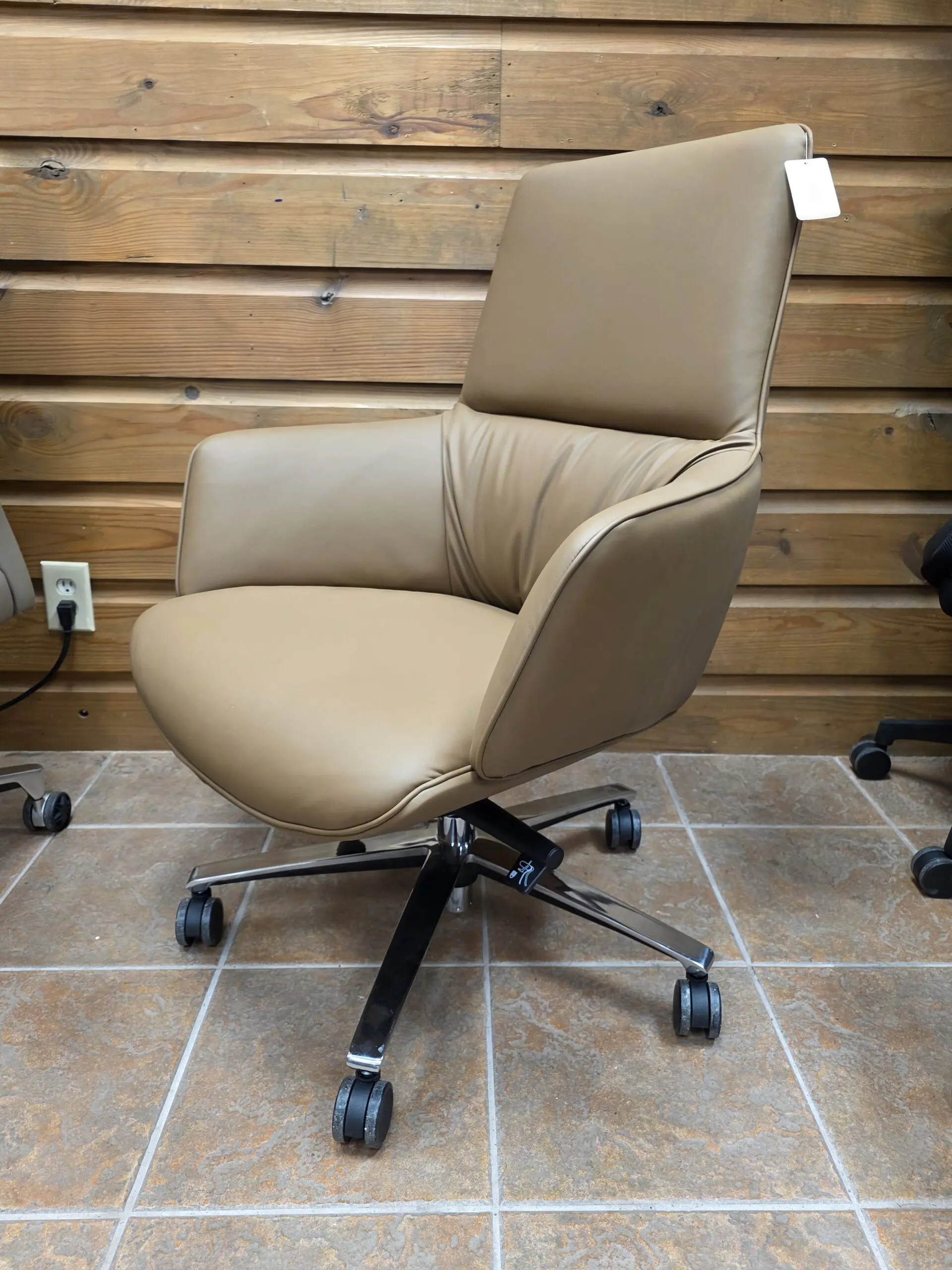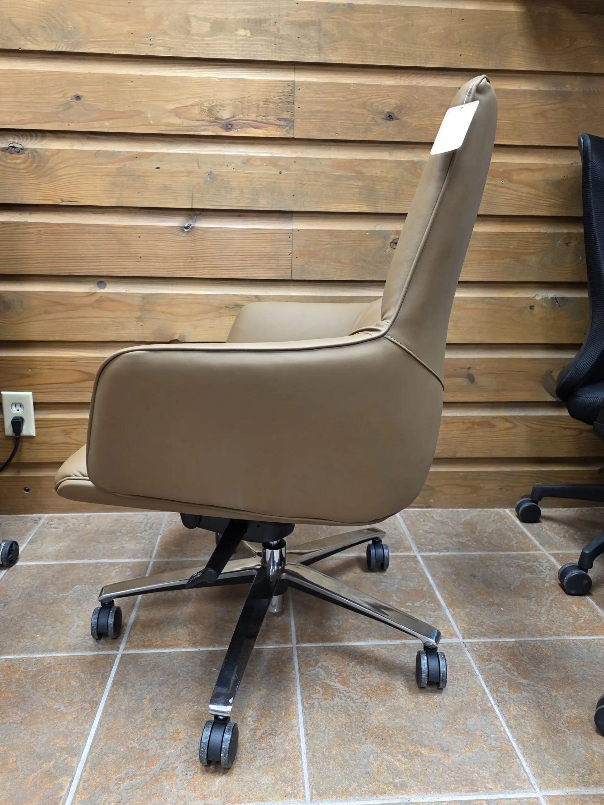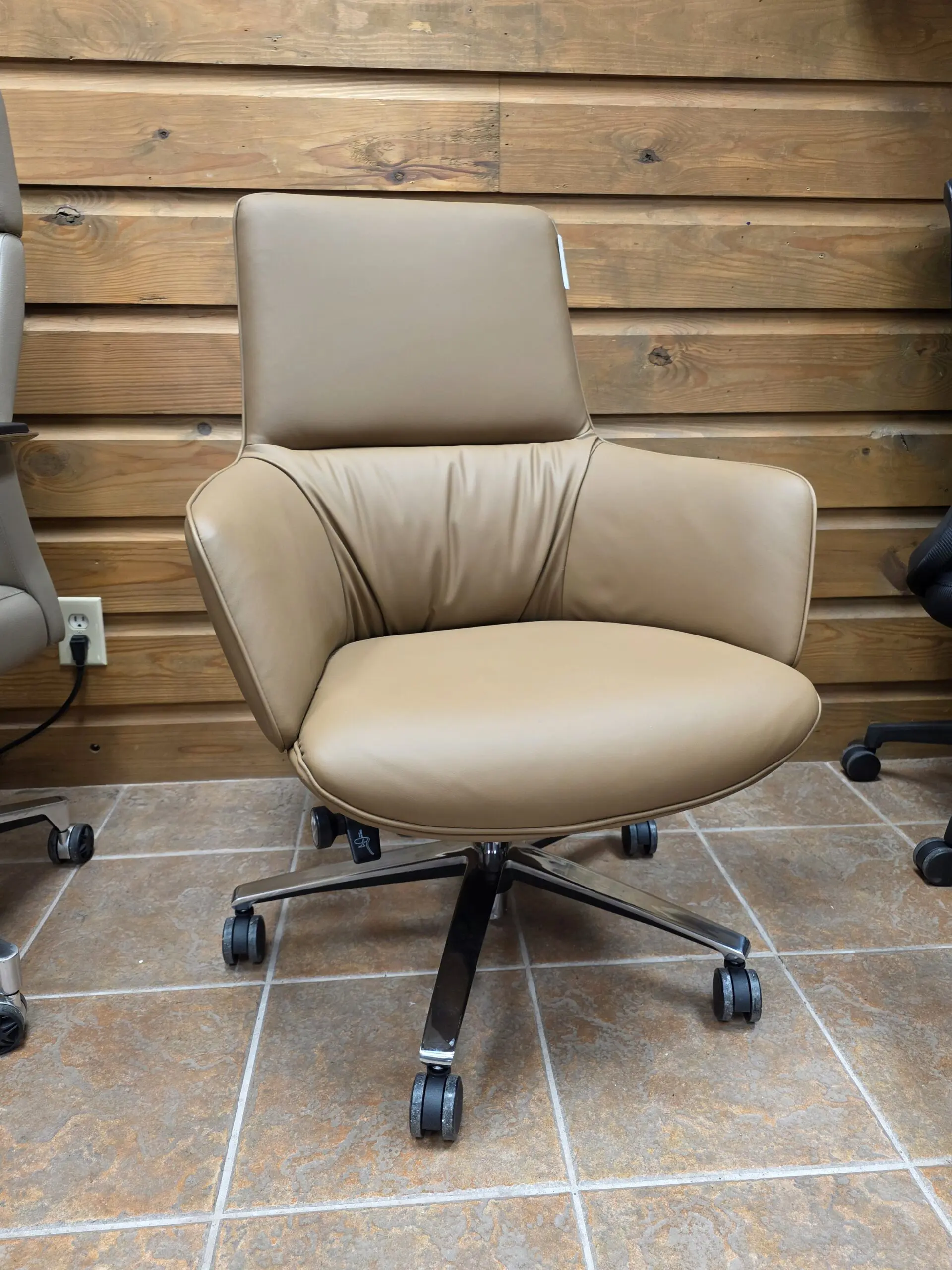 Built on a strong chrome-finished 5-star swivel base, this executive chair features smooth-rolling casters for easy movement across tile, wood, or carpet. The modern silhouette and warm tan color add a refined touch to any office environment, making it a standout piece for executive suites, conference tables, or stylish home office setups.