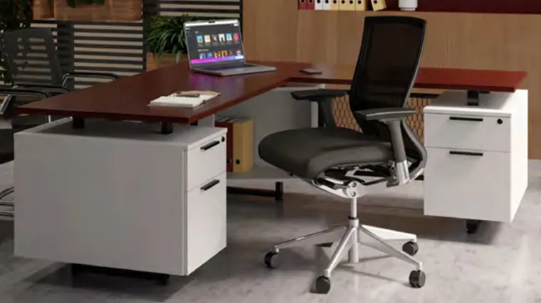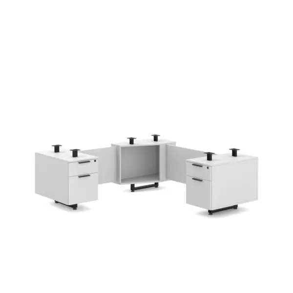 This spacious 72"x72" L-shaped layout provides an expansive worksurface ideal for multitasking, computer setups, meetings, and day-to-day productivity. The desk includes two integrated pedestals, each offering ample storage for files, supplies, and personal items. The pedestals come in a sleek white finish, delivering a crisp, modern look that pairs beautifully with any workspace aesthetic.