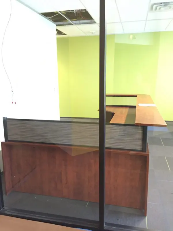 BORDERS U SHAPE RECEPTION DESK WITH GLAZED REVEAL SELECT DIRECTION, SIZE, and FINISH (Cherry Shown)