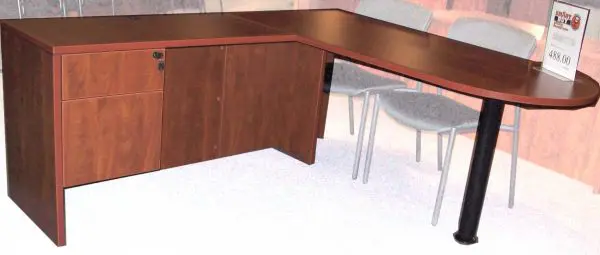 Incredible L Shape Desk Value. 66 x 30 Bullet Desk, 42 x 24 Return, Box/File Pedestal featuring a core removable lock, steel ball bearing whisper-glide slides on drawers. Manufactured of durable commercial grade IP laminate construction making this L Desk heat, stain, moisture, abrasion, and peel resistant, and fore-arm friendly 3MM Poly Vinyl Chloride (PVC) edges. This office desk is fully sealed on all edges (even the invisible ones at the bottom of the desk). It also includes leveling glides on all corners which help to guarantee flawless drawer alignment and operation no matter what the office floor is like.