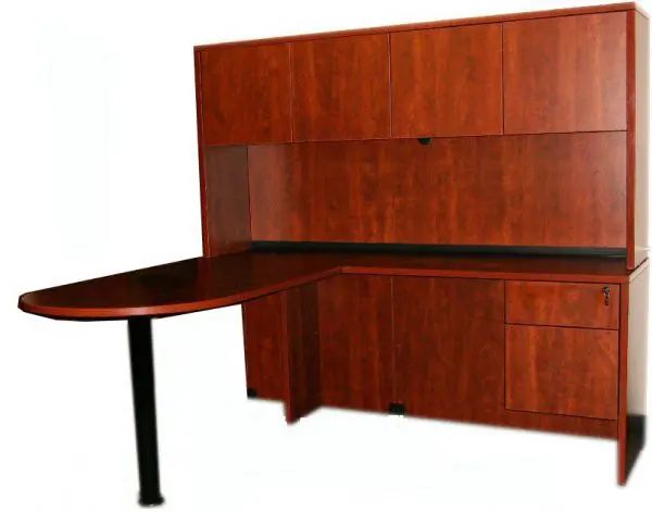 Upgrade your office with the Peninsula L Shaped Desk and 71 Inch Hutch. This desk set includes a 66 x 71 Bullet L Desk and Hutch, featuring a 30 x 66 Bullet Desk, 20 x 42 Return, Box/File Hanging Pedestal, and 71" Overhead Hutch.